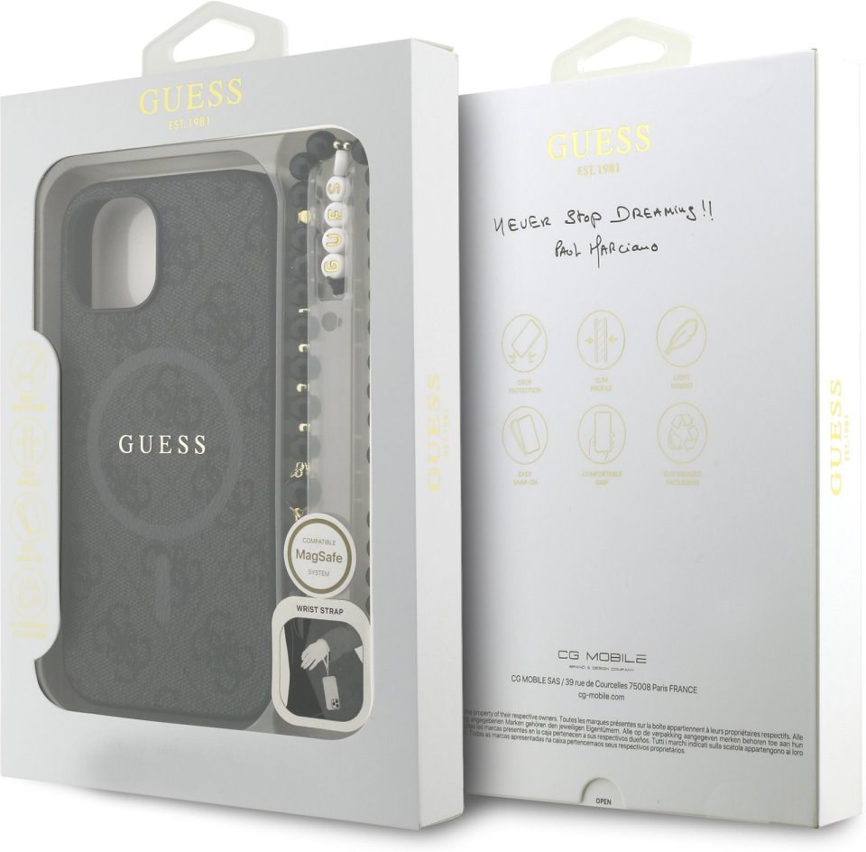 Guess PU Leather 4G Colored Ring Strap MagSafe zadný kryt je dokonalý doplnok pre váš telefón aj váš outfit, ktorý kombinuje funkčnosť a štýl v jednom. Je vyrobený z ľahkej a odolnej PU umelej kože a ponúka skvelú ochranu telefónu aj pohodlia pri používaní. Povrchová úprava krytu zaisťuje, že sa skvele drží v ruke a nešmýka sa, čo minimalizuje riziko vykĺznutia telefónu. Vďaka presnému tvaru perfektne sedí na telefóne a umožňuje ľahký prístup ku všetkým tlačidlám a konektorom. Tento kryt podporuje technológiu MagSafe, čo znamená, že je kompatibilný s bezdrôtovým nabíjaním a ďalšími MagSafe doplnkami. Guess "4G" elegantná potlač a kovové logo ponúka nielen decentný, ale aj luxusný vzhľad. Kryt je doplnený elegantným koralovým pútkom, ktorý môžete nasadiť na zápästie, aby vám telefón nevykĺzol z ruky. To vám zaručí bezpečné manipulovanie s vaším zariadením. Pokiaľ teda hľadáte kryt, ktorý kombinuje eleganciu a funkčnosť, je tento kúsok od Guess tou pravou voľbou pre vás.Kľúčové vlastnosti