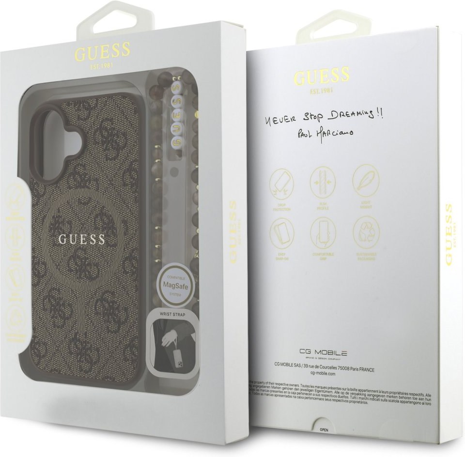 Guess PU Leather 4G Colored Ring Strap MagSafe zadný kryt je dokonalý doplnok pre váš telefón aj váš outfit, ktorý kombinuje funkčnosť a štýl v jednom. Je vyrobený z ľahkej a odolnej PU umelej kože a ponúka skvelú ochranu telefónu aj pohodlia pri používaní. Povrchová úprava krytu zaisťuje, že sa skvele drží v ruke a nešmýka sa, čo minimalizuje riziko vykĺznutia telefónu. Vďaka presnému tvaru perfektne sedí na telefóne a umožňuje ľahký prístup ku všetkým tlačidlám a konektorom. Tento kryt podporuje technológiu MagSafe, čo znamená, že je kompatibilný s bezdrôtovým nabíjaním a ďalšími MagSafe doplnkami. Guess "4G" elegantná potlač a kovové logo ponúka nielen decentný, ale aj luxusný vzhľad. Kryt je doplnený elegantným koralovým pútkom, ktorý môžete nasadiť na zápästie, aby vám telefón nevykĺzol z ruky. To vám zaručí bezpečné manipulovanie s vaším zariadením. Pokiaľ teda hľadáte kryt, ktorý kombinuje eleganciu a funkčnosť, je tento kúsok od Guess tou pravou voľbou pre vás.Kľúčové vlastnosti