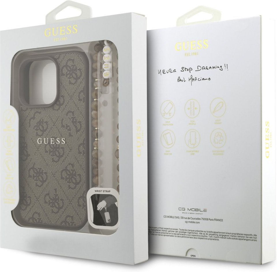 Guess PU Leather 4G Colored Ring Strap MagSafe zadný kryt je dokonalý doplnok pre váš telefón aj váš outfit, ktorý kombinuje funkčnosť a štýl v jednom. Je vyrobený z ľahkej a odolnej PU umelej kože a ponúka skvelú ochranu telefónu aj pohodlia pri používaní. Povrchová úprava krytu zaisťuje, že sa skvele drží v ruke a nešmýka sa, čo minimalizuje riziko vykĺznutia telefónu. Vďaka presnému tvaru perfektne sedí na telefóne a umožňuje ľahký prístup ku všetkým tlačidlám a konektorom. Tento kryt podporuje technológiu MagSafe, čo znamená, že je kompatibilný s bezdrôtovým nabíjaním a ďalšími MagSafe doplnkami. Guess "4G" elegantná potlač a kovové logo ponúka nielen decentný, ale aj luxusný vzhľad. Kryt je doplnený elegantným koralovým pútkom, ktorý môžete nasadiť na zápästie, aby vám telefón nevykĺzol z ruky. To vám zaručí bezpečné manipulovanie s vaším zariadením. Pokiaľ teda hľadáte kryt, ktorý kombinuje eleganciu a funkčnosť, je tento kúsok od Guess tou pravou voľbou pre vás.Kľúčové vlastnosti