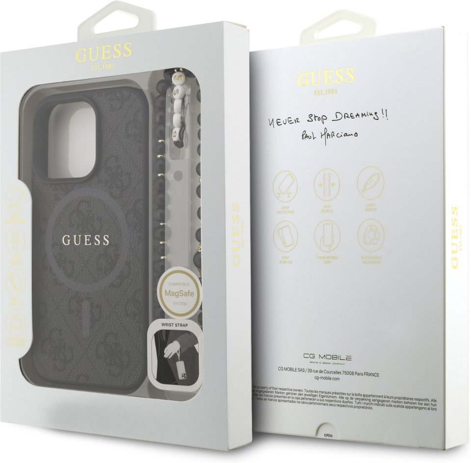 Guess PU Leather 4G Colored Ring Strap MagSafe zadný kryt je dokonalý doplnok pre váš telefón aj váš outfit, ktorý kombinuje funkčnosť a štýl v jednom. Je vyrobený z ľahkej a odolnej PU umelej kože a ponúka skvelú ochranu telefónu aj pohodlia pri používaní. Povrchová úprava krytu zaisťuje, že sa skvele drží v ruke a nešmýka sa, čo minimalizuje riziko vykĺznutia telefónu. Vďaka presnému tvaru perfektne sedí na telefóne a umožňuje ľahký prístup ku všetkým tlačidlám a konektorom. Tento kryt podporuje technológiu MagSafe, čo znamená, že je kompatibilný s bezdrôtovým nabíjaním a ďalšími MagSafe doplnkami. Guess "4G" elegantná potlač a kovové logo ponúka nielen decentný, ale aj luxusný vzhľad. Kryt je doplnený elegantným koralovým pútkom, ktorý môžete nasadiť na zápästie, aby vám telefón nevykĺzol z ruky. To vám zaručí bezpečné manipulovanie s vaším zariadením. Pokiaľ teda hľadáte kryt, ktorý kombinuje eleganciu a funkčnosť, je tento kúsok od Guess tou pravou voľbou pre vás.Kľúčové vlastnosti