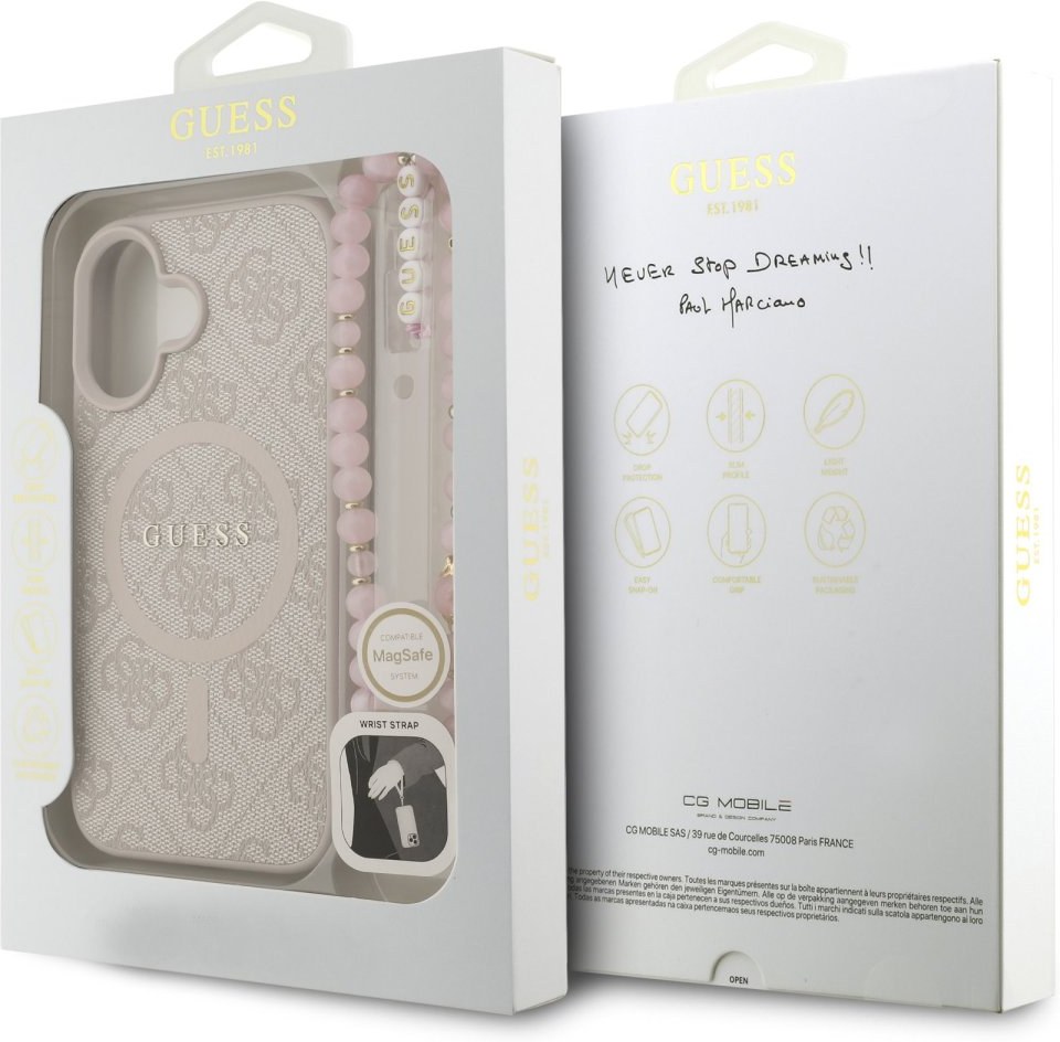 Guess PU Leather 4G Colored Ring Strap MagSafe zadný kryt je dokonalý doplnok pre váš telefón aj váš outfit, ktorý kombinuje funkčnosť a štýl v jednom. Je vyrobený z ľahkej a odolnej PU umelej kože a ponúka skvelú ochranu telefónu aj pohodlia pri používaní. Povrchová úprava krytu zaisťuje, že sa skvele drží v ruke a nešmýka sa, čo minimalizuje riziko vykĺznutia telefónu. Vďaka presnému tvaru perfektne sedí na telefóne a umožňuje ľahký prístup ku všetkým tlačidlám a konektorom. Tento kryt podporuje technológiu MagSafe, čo znamená, že je kompatibilný s bezdrôtovým nabíjaním a ďalšími MagSafe doplnkami. Guess "4G" elegantná potlač a kovové logo ponúka nielen decentný, ale aj luxusný vzhľad. Kryt je doplnený elegantným koralovým pútkom, ktorý môžete nasadiť na zápästie, aby vám telefón nevykĺzol z ruky. To vám zaručí bezpečné manipulovanie s vaším zariadením. Pokiaľ teda hľadáte kryt, ktorý kombinuje eleganciu a funkčnosť, je tento kúsok od Guess tou pravou voľbou pre vás.Kľúčové vlastnosti