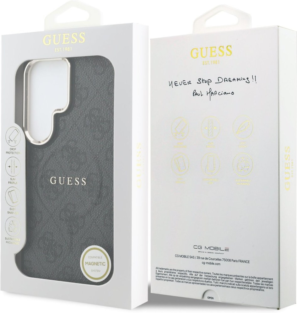 Guess PU Leather 4G Colored Ring Magnetic zadný kryt je dokonalý doplnok pre váš telefón aj váš outfit, ktorý kombinuje funkčnosť a štýl v jednom. Je vyrobený z ľahkej a odolnej PU umelej kože a ponúka skvelú ochranu telefónu aj pohodlia pri používaní. Povrchová úprava krytu zaisťuje, že sa skvele drží v ruke a nešmýka sa, čo minimalizuje riziko vykĺznutia telefónu. Vďaka presnému tvaru perfektne sedí na telefóne a umožňuje ľahký prístup ku všetkým tlačidlám a konektorom. Tento model je vybavený magnetickou funkciou, ktorá umožňuje ľahké a bezpečné uchytenie k magnetickým držiakom – napríklad v aute. Magnet vo vnútri krytu drží pevne bez toho, aby narušoval signál alebo funkčnosť zariadenia, a pritom zachováva štíhly profil celého puzdra. Ide tak o praktické riešenie pre každého. Guess "4G" elegantná potlač a kovové logo dodávajú krytu luxusný a zároveň decentný vzhľad. Pokiaľ teda hľadáte kryt, ktorý kombinuje eleganciu, funkčnosť a praktické využitie aj na cestách, je tento kúsok od Guess tou pravou voľbou pre vás.Kľúčové vlastnosti
