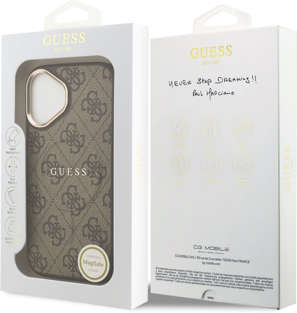 Guess PU Leather 4G MagSafe zadný kryt je dokonalý doplnok pre váš telefón aj váš outfit, ktorý kombinuje funkčnosť a štýl v jednom. Je vyrobený z ľahkej a odolnej PU umelej kože a ponúka skvelú ochranu telefónu aj pohodlia pri používaní. Povrchová úprava krytu zaisťuje, že sa skvele drží v ruke a nešmýka sa, čo minimalizuje riziko vykĺznutia telefónu. Vďaka presnému tvaru perfektne sedí na telefóne a umožňuje ľahký prístup ku všetkým tlačidlám a konektorom. Tento kryt podporuje technológiu MagSafe, čo znamená, že je kompatibilný s bezdrôtovým nabíjaním a ďalšími MagSafe doplnkami. Guess „4G“ elegantná potlač ponúka luxusný vzhľad. Rámček zadného fotoaparátu je zdobený elegantným zlatým prevedením, ktorý krytu dodáva ešte luxusnejší vzhľad. Pokiaľ teda hľadáte kryt, ktorý kombinuje eleganciu a funkčnosť, je tento kúsok od Guess tou pravou voľbou pre vás.Kľúčové vlastnosti