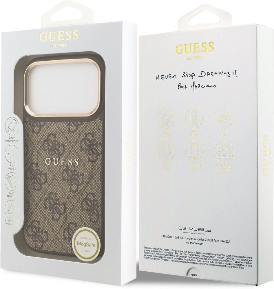 Guess PU Leather 4G MagSafe zadný kryt je dokonalý doplnok pre váš telefón aj váš outfit, ktorý kombinuje funkčnosť a štýl v jednom. Je vyrobený z ľahkej a odolnej PU umelej kože a ponúka skvelú ochranu telefónu aj pohodlia pri používaní. Povrchová úprava krytu zaisťuje, že sa skvele drží v ruke a nešmýka sa, čo minimalizuje riziko vykĺznutia telefónu. Vďaka presnému tvaru perfektne sedí na telefóne a umožňuje ľahký prístup ku všetkým tlačidlám a konektorom. Tento kryt podporuje technológiu MagSafe, čo znamená, že je kompatibilný s bezdrôtovým nabíjaním a ďalšími MagSafe doplnkami. Guess „4G“ elegantná potlač ponúka luxusný vzhľad. Rámček zadného fotoaparátu je zdobený elegantným zlatým prevedením, ktorý krytu dodáva ešte luxusnejší vzhľad. Pokiaľ teda hľadáte kryt, ktorý kombinuje eleganciu a funkčnosť, je tento kúsok od Guess tou pravou voľbou pre vás.Kľúčové vlastnosti