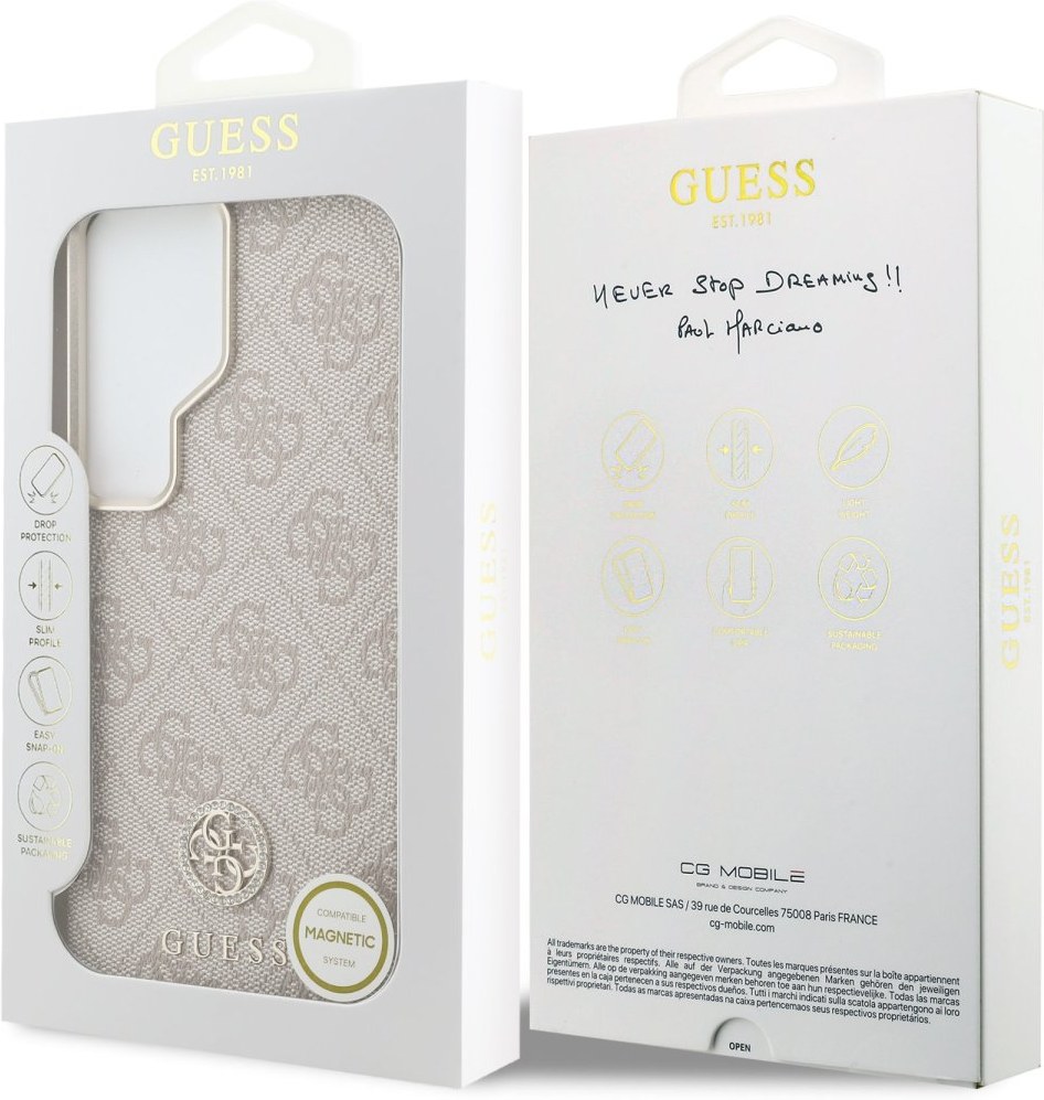 Guess PU Leather 4G Strass Logo Gold Frame zadný kryt je dokonalý doplnok pre váš telefón aj váš outfit, ktorý kombinuje funkčnosť a štýl v jednom. Je vyrobený z ľahkej a odolnej PU umelej kože a ponúka skvelú ochranu a pohodlie pri používaní. Povrchová úprava krytu zaisťuje, že sa skvele drží v ruke a nešmýka sa, čo minimalizuje riziko vykĺznutia telefónu. Vďaka presnému tvaru perfektne sedí na telefóne a umožňuje ľahký prístup ku všetkým tlačidlám a konektorom. Tento model je vybavený magnetickou funkciou, ktorá umožňuje ľahké a bezpečné uchytenie k magnetickým držiakom – napríklad v aute. Magnet vo vnútri krytu drží pevne bez toho, aby narušoval signál alebo funkčnosť zariadenia, a pritom zachováva štíhly profil celého puzdra. Ide tak o praktické riešenie pre každého. Guess „4G“ elegantná potlač doplnenou o Strass Logo ponúka nielen luxusný, ale aj nápaditý dizajn. Rámček zadného fotoaparátu je navyše zdobený elegantným zlatým prevedením, ktorý krytu dodáva ešte luxusnejší vzhľad. Pokiaľ teda hľadáte kryt, ktorý kombinuje eleganciu a funkčnosť, je tento kúsok od Guess tou pravou voľbou pre vás.Kľúčové vlastnosti