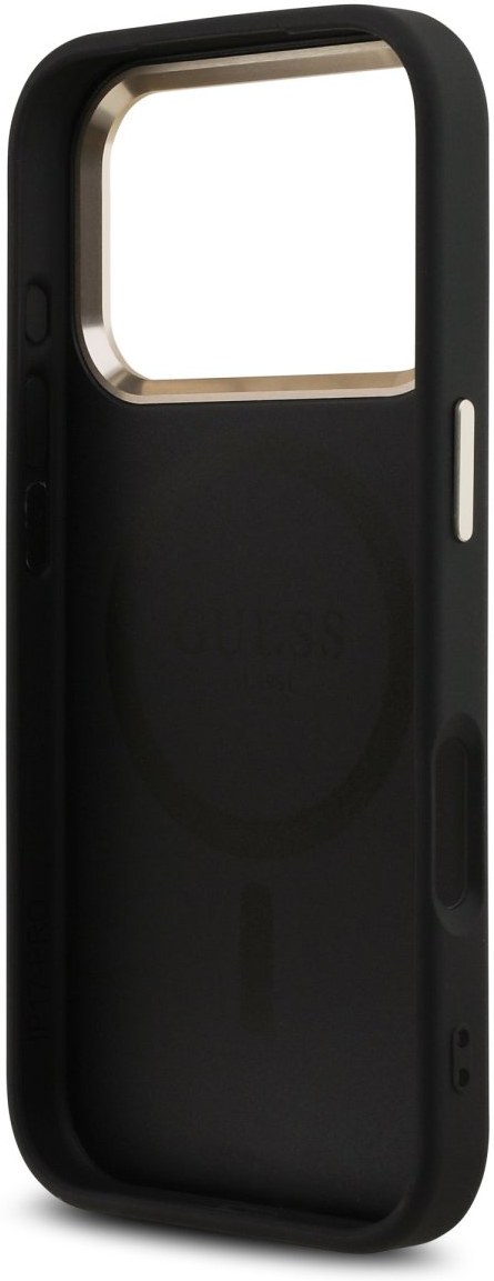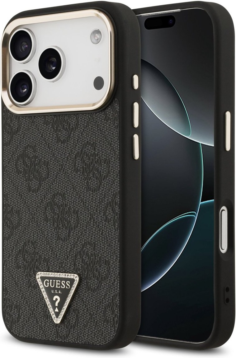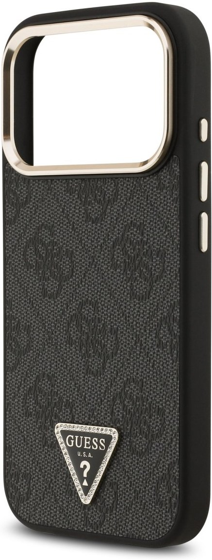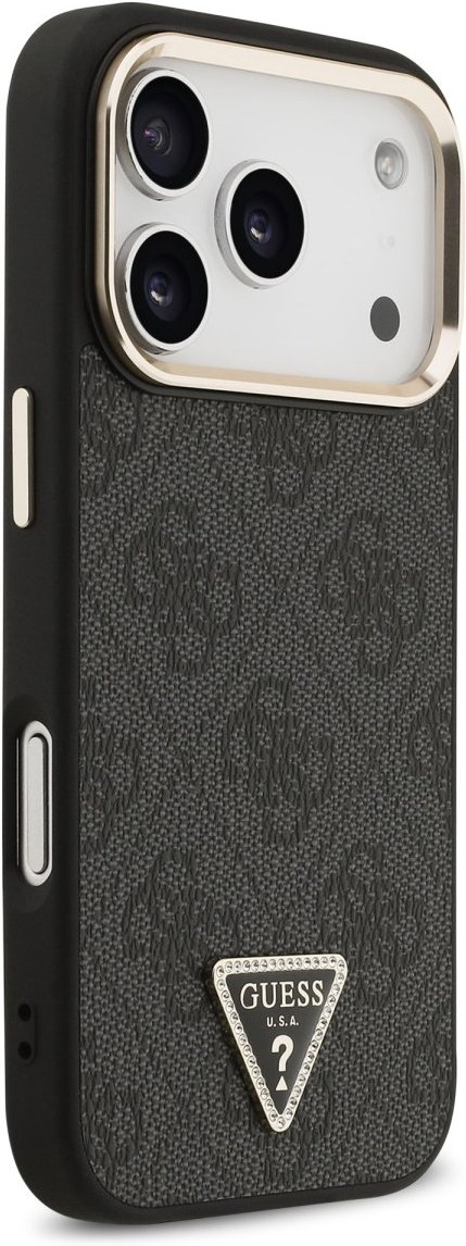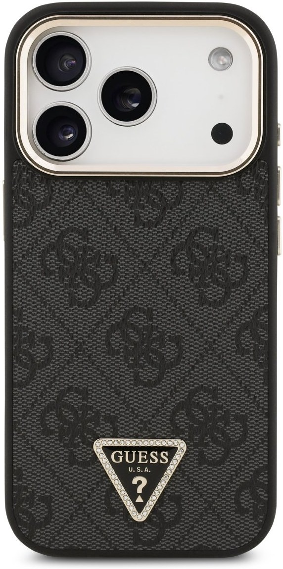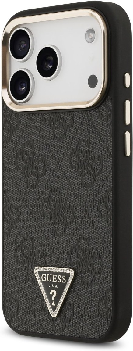 Guess PU Leather 4G Triangle Logo Gold Frame MagSafe kryt pre iPhone 17 Pro, čierny