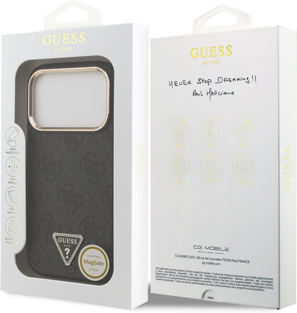 Guess PU Leather 4G Triangle Logo Gold Frame zadný kryt je dokonalý doplnok pre váš telefón aj váš outfit, ktorý kombinuje funkčnosť a štýl v jednom. Je vyrobený z ľahkej a odolnej PU umelej kože a ponúka skvelú ochranu a pohodlie pri používaní. Povrchová úprava krytu zaisťuje, že sa skvele drží v ruke a nešmýka sa, čo minimalizuje riziko vykĺznutia telefónu. Vďaka presnému tvaru perfektne sedí na telefóne a umožňuje ľahký prístup ku všetkým tlačidlám a konektorom. Kryt podporuje technológiu MagSafe, čo znamená, že je kompatibilný s bezdrôtovým nabíjaním a ďalšími MagSafe doplnkami. Guess „4G“ elegantná potlač doplnená o zlaté triangle logo GUESS ponúka nielen luxusný, ale aj nápaditý dizajn. Rámček zadného fotoaparátu je navyše zdobený elegantným zlatým prevedením, ktorý krytu dodáva ešte luxusnejší vzhľad. Pokiaľ teda hľadáte kryt, ktorý kombinuje eleganciu a funkčnosť, je tento kúsok od Guess tou pravou voľbou pre vás.Kľúčové vlastnosti
