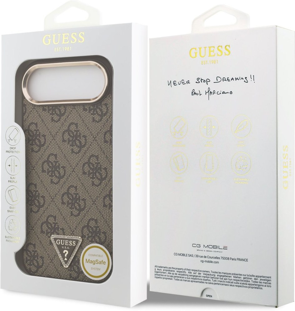 Guess PU Leather 4G Triangle Logo Gold Frame zadný kryt je dokonalý doplnok pre váš telefón aj váš outfit, ktorý kombinuje funkčnosť a štýl v jednom. Je vyrobený z ľahkej a odolnej PU umelej kože a ponúka skvelú ochranu a pohodlie pri používaní. Povrchová úprava krytu zaisťuje, že sa skvele drží v ruke a nešmýka sa, čo minimalizuje riziko vykĺznutia telefónu. Vďaka presnému tvaru perfektne sedí na telefóne a umožňuje ľahký prístup ku všetkým tlačidlám a konektorom. Kryt podporuje technológiu MagSafe, čo znamená, že je kompatibilný s bezdrôtovým nabíjaním a ďalšími MagSafe doplnkami. Guess „4G“ elegantná potlač doplnená o zlaté triangle logo GUESS ponúka nielen luxusný, ale aj nápaditý dizajn. Rámček zadného fotoaparátu je navyše zdobený elegantným zlatým prevedením, ktorý krytu dodáva ešte luxusnejší vzhľad. Pokiaľ teda hľadáte kryt, ktorý kombinuje eleganciu a funkčnosť, je tento kúsok od Guess tou pravou voľbou pre vás.Kľúčové vlastnosti