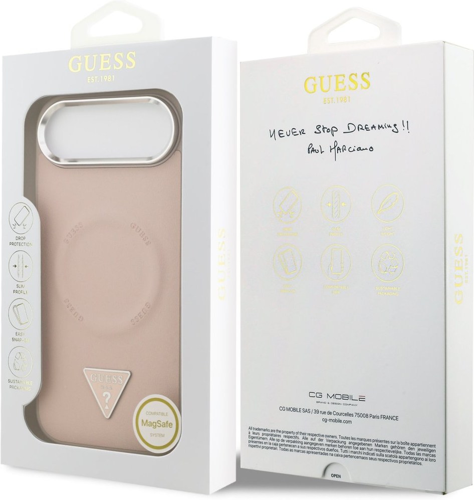 Guess PU Leather Triangle Logo zadný kryt je dokonalý doplnok pre váš telefón aj váš outfit, ktorý kombinuje funkčnosť a štýl v jednom. Je vyrobený z ľahkej a odolnej PU umelej kože a ponúka skvelú ochranu a pohodlie pri používaní. Povrchová úprava krytu zaisťuje, že sa skvele drží v ruke a nešmýka sa, čo minimalizuje riziko vykĺznutia telefónu. Vďaka presnému tvaru perfektne sedí na telefóne a umožňuje ľahký prístup ku všetkým tlačidlám a konektorom. Kryt podporuje technológiu MagSafe, čo znamená, že je kompatibilný s bezdrôtovým nabíjaním a ďalšími MagSafe doplnkami. Elegantný triangle logo GUESS ponúka nielen luxusný, ale aj nápaditý dizajn. Pokiaľ teda hľadáte kryt, ktorý kombinuje eleganciu a funkčnosť, je tento kúsok od Guess tou pravou voľbou pre vás.Kľúčové vlastnosti