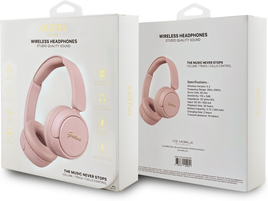 Štýlové bezdrôtové slúchadlá cez hlavu od značky Guess kombinujú moderný dizajn, kvalitný zvuk a maximálne pohodlie. Vďaka viditeľnému logu Guess na mušliach pôsobí elegantne a luxusne – ideálny doplnok nielen na cestovanie, ale aj do práce alebo posilňovne. Ovládanie hudby aj hovorov je jednoduché vďaka praktickým tlačidlám priamo na slúchadlách. Pružný rám zaisťuje stabilitu, zatiaľ čo mäkké náušníky a čelenka potiahnutá komfortným materiálom sa postarajú o pohodlné počúvanie aj po niekoľkých hodinách. Skvelý zvuk s výraznými basmi a vyváženými výškami podčiarkuje 40mm menič. Slúchadlá navyše podporujú hlasového asistenta a hands-free volania vďaka integrovanému mikrofónu. A s výdržou až 30 hodín sa len tak nevybijú.Technické parametre