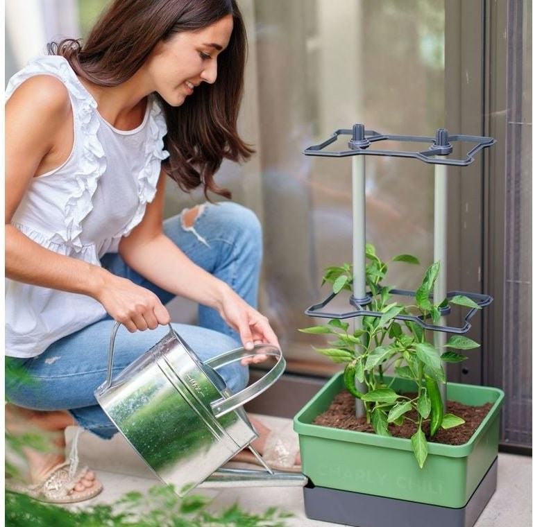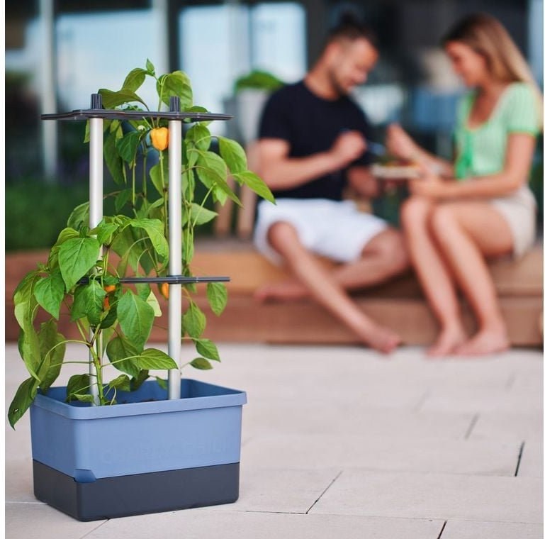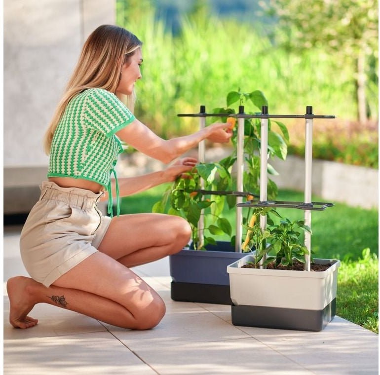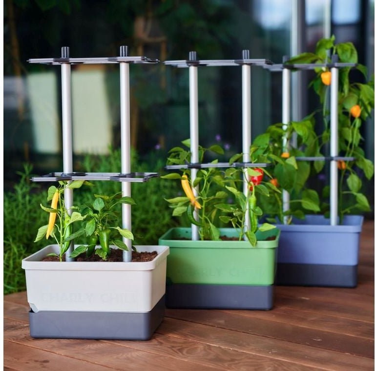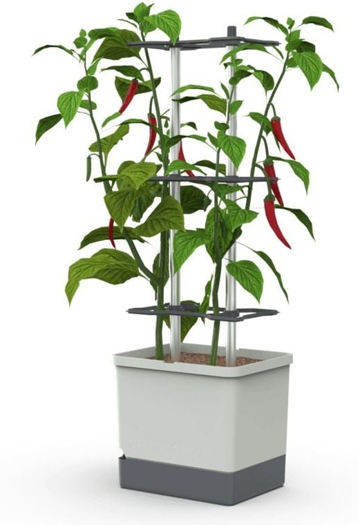 Samozavlažovací kvetináč na chilli so zásobníkom na vodu a systémom na šplhanie.Stačí zalievať 1–2 krát týždenne