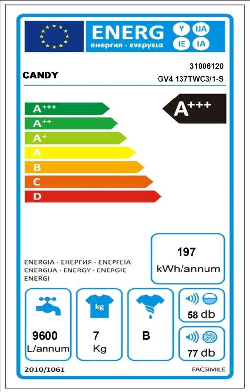 Spredu plnená automatická práčka Candy GV4 137 TWC3 pracuje vo výnimočne úspornej energetickej triede A +++ a môže sa chváliť označením triedy účinnosti prania A. Iste si obľúbite funkciu odložený štart až na 23 hod. S touto možnosťou si napríklad ráno naplníte práčku pred odchodom do práce a po príchode domov, budete mať bielizeň čerstvo vypranú. Alebo tak môžete nastaviť štart na nočnú hodinu s lacnejšou sadzbou elektriny.http://www.candy-hoover.cz
