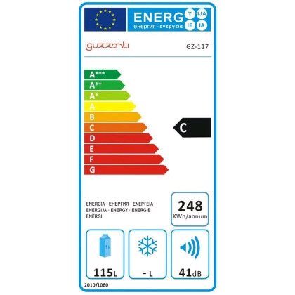 Voľne stojace moderná chladiaca vitrína Guzzanti GZ 117 s 2 drôtenými policami a nerezovou rukoväťou. Vitrína ponúka kapacitu s objemom 117L s temperovaným sklom. Smer otvárania dverí vitríny je možné ľahko meniť a police sú nastaviteľné. Nastaviteľná teplota chladenia už od 3°CObjem 117 l