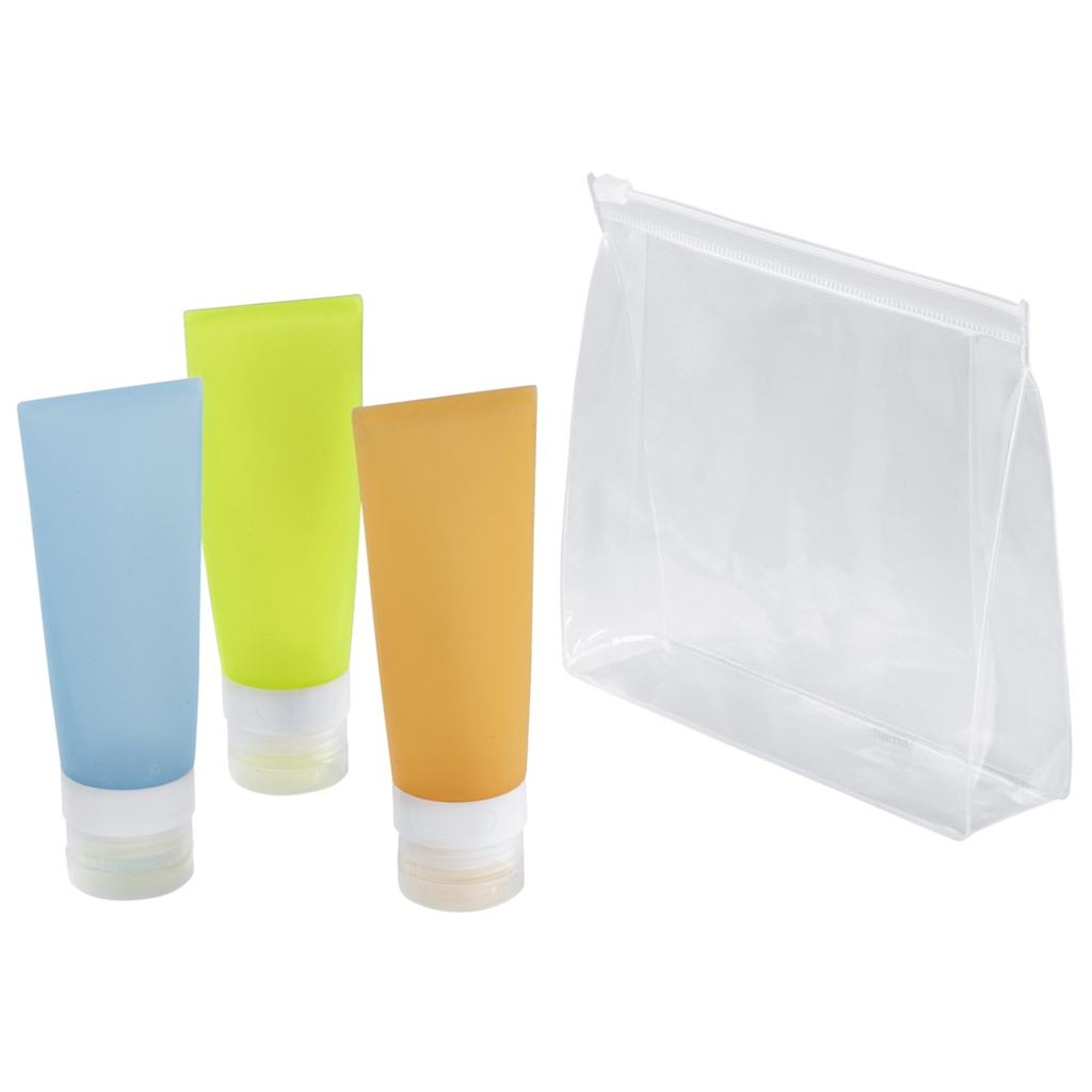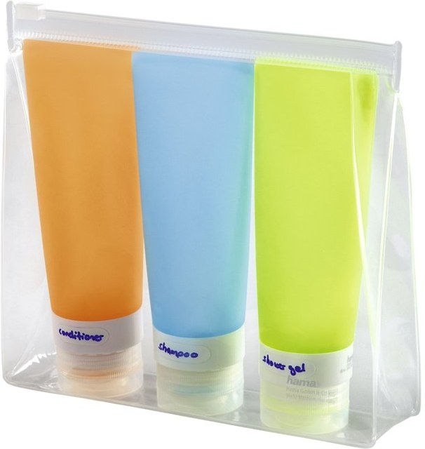 - 3x silikónová fľaštička s objemom 85 ml, napr. na šampón, sprchovací gél, mlieko na opaľovanie