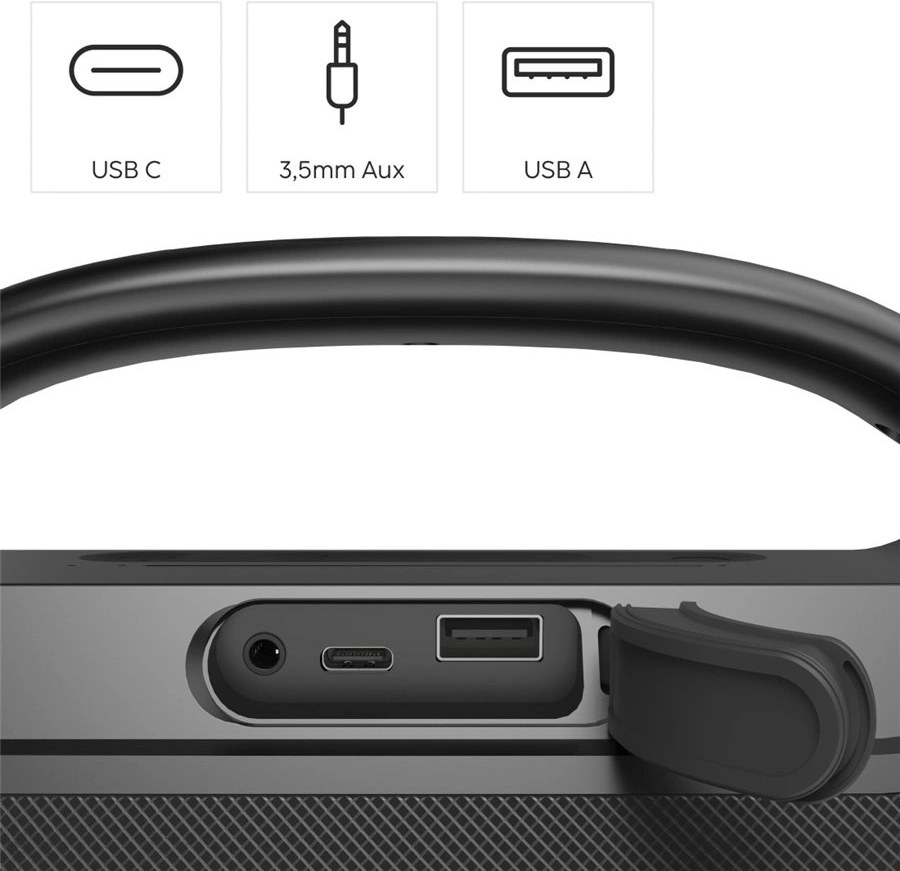 prenosný reproduktor s powerbankou, vodeodolný, hudobný výkon 60 W, pripojenie USB, Bluetooth, kapacita batérie 3 600 mAh, maximálny výkon 10 W (USB-A)Zobraziť viac