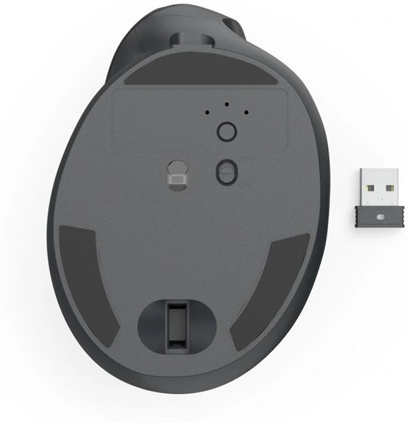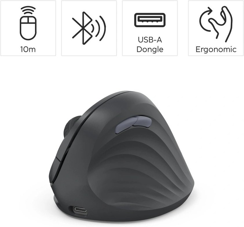 - 8-tlačidlová ergonomická bezdrôtová optická myš s voliteľným pripojením na tri zariadenia: 1x bezdrôtový USB prijímač a 2xBluetooth- vertikálne prevedenie predchádza presileniu a bolesti ramien a zápästí