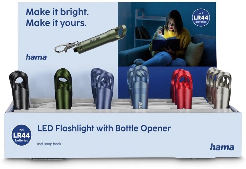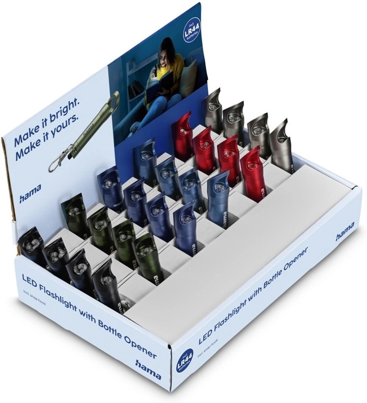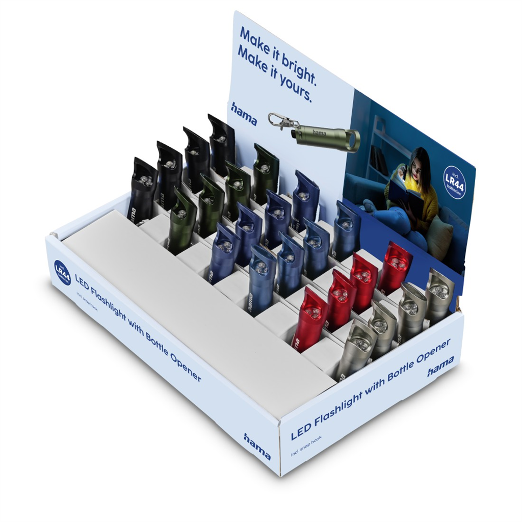 Hama FL4, LED baterka s otváračom na fľaše, karabínka, batérie, 24 ks v displeji