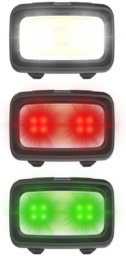 - 7 režimov svietenia: biela LED a COB LED s veľmi silným svetlom (350 lm / 60 m), silným svetlom (250 lm / 60 m), tlmeným svetlom (90 lm / 20 m) a blikaním (250 lm / 20 m), takisto ako červené a zelené svetlo