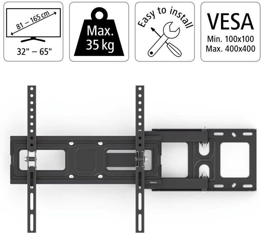 - pohyblivý držiak pre TV obrazovky s uhlopriečkou cca. 32 až 65 palcov (81 až 165 cm)- podpora VESA (rozteč závitov): 100x100 až 400x400
