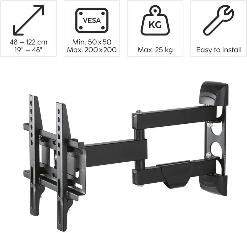 - pohyblivý držiak pre TV obrazovky s uhlopriečkou cca. 48-122 cm (19“-48“)- VESA max. 200x200, nastaviteľné ramená pre akúkoľvek menšiu rozteč závitov