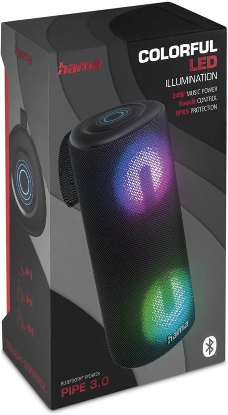 Hama Pipe 3.0, Bluetooth reproduktor, vode odolný podľa IPX5, 24 W, 10 svetelných režimov, čierny