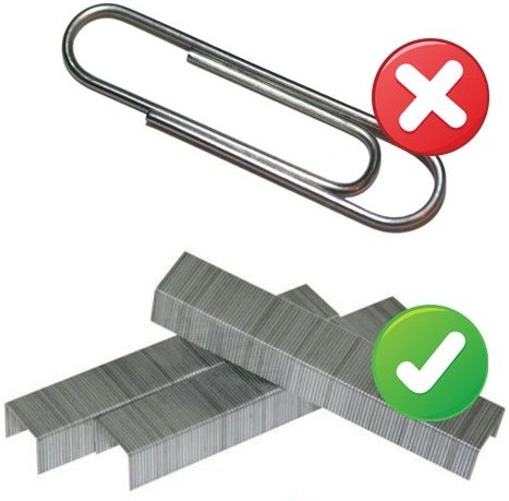 - vysokokvalitné nože vyrobené z ocele si poradia aj so zošívacími sponkami; zošívacie sponky spoja listy papiera natrvalo, nie sú to kancelárske spinky na dočasné zopnutie listov papiera (viď obrázok v galérii obrázkov)