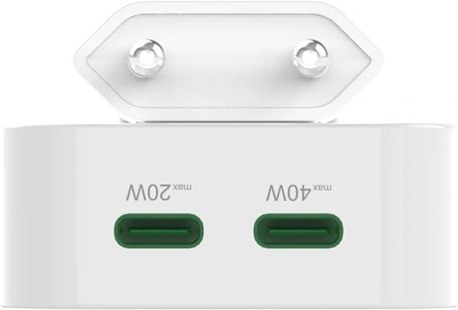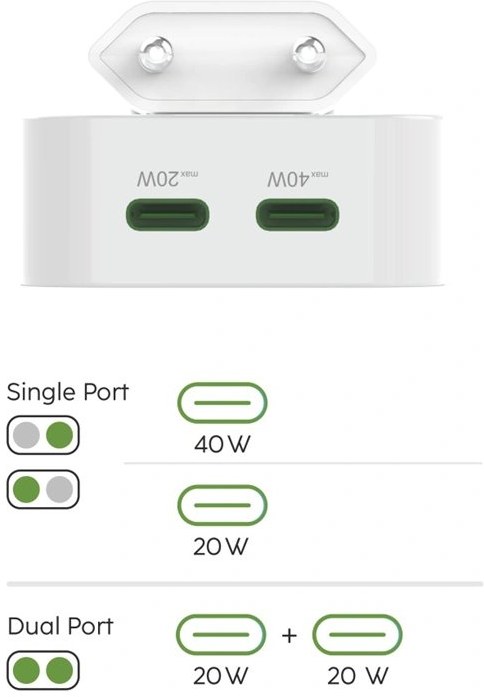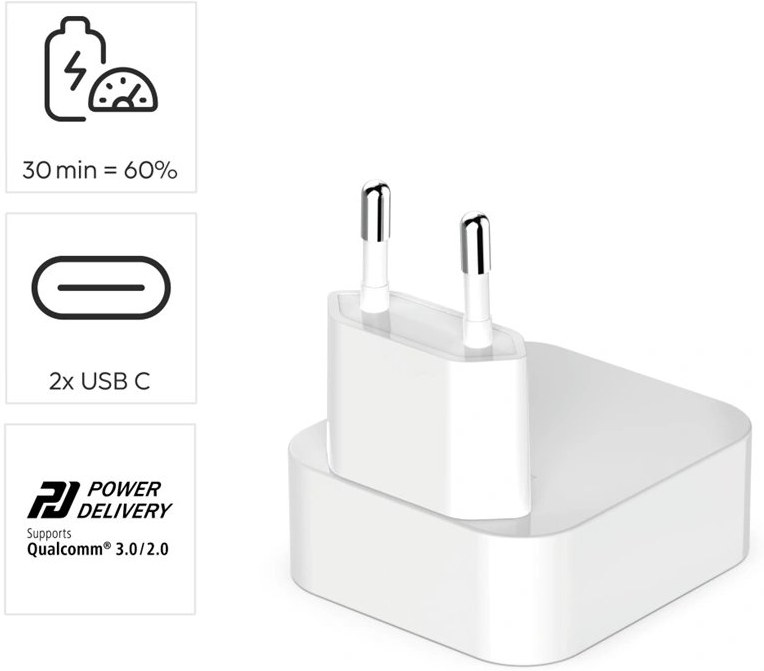 - univerzálna USB nabíjačka pre všetky zariadenia umožňujúce nabíjanie/napájanie cez USB- 2x USB-C výstup pre nabíjanie dvoch zariadení súčasne