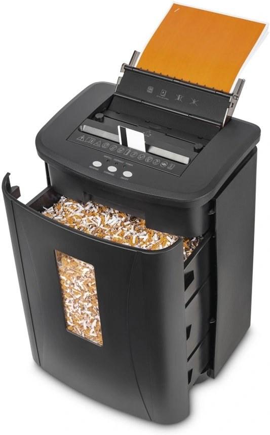 - rezanie papiera na mimoriadne malé kúsky, čo maximalizuje kapacitu koša; kôš môžete vytiahnuť pre ľahké vysypanie zoskartovaného papiera