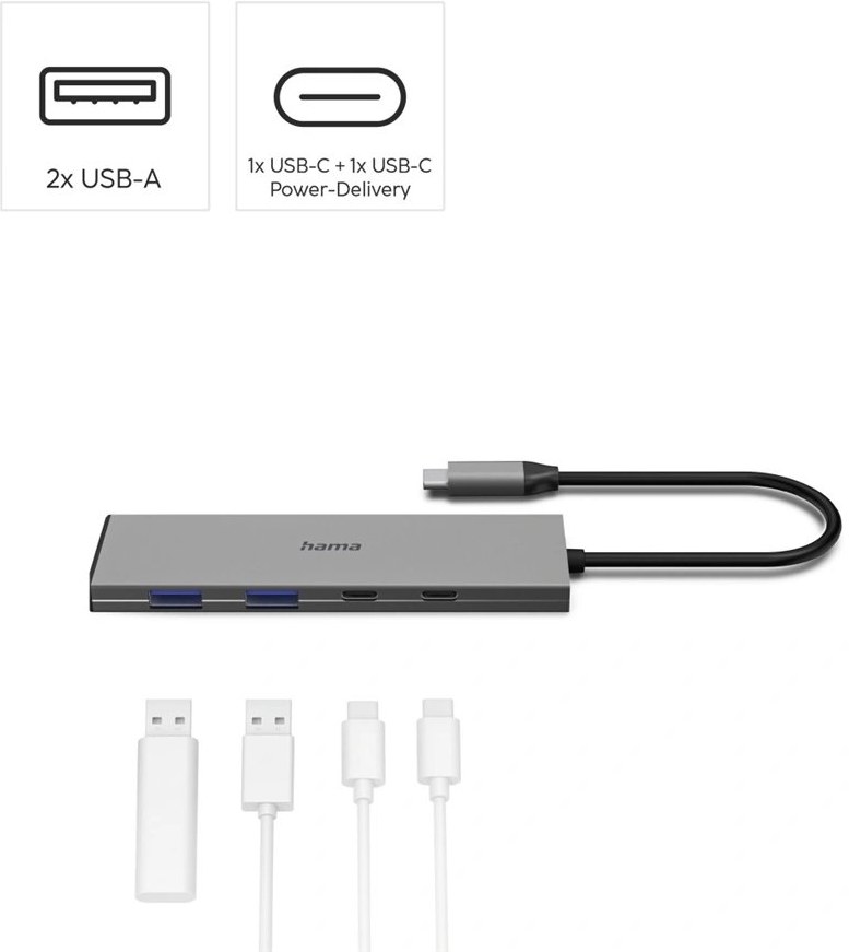 Hama USB-C Hub, 4 porty, USB 3.2, 10 Gbit/s, PD 100 W, hliníkový