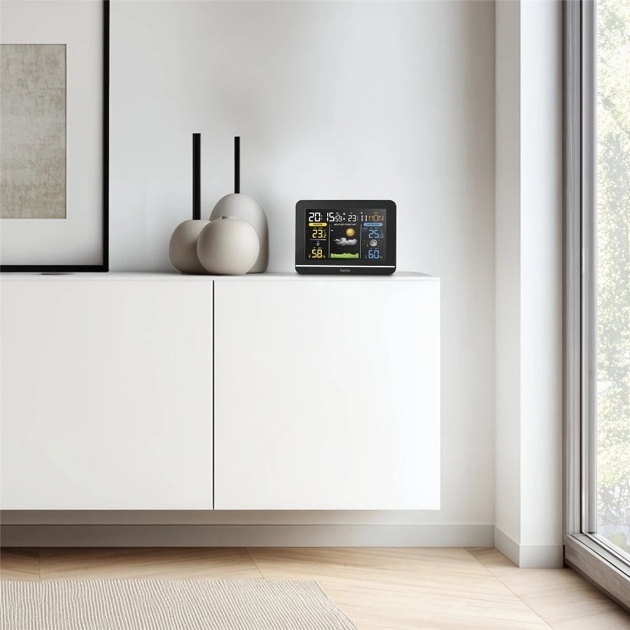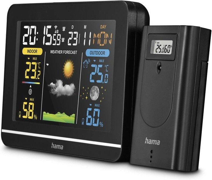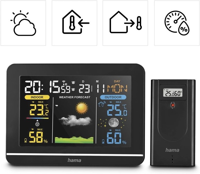 Moderná meteostanica Hama Usedom je ideálnym riešením pre domácnosti, ktoré chcú mať prehľad o aktuálnych poveternostných podmienkach. Vďaka farebnému VA displeju, bezdrôtovému senzoru a intuitívnemu ovládaniu ponúka prehľadné zobrazenie teploty, vlhkosti, času, dátumu, fázy mesiaca a predpovede počasia.Technické parametre: