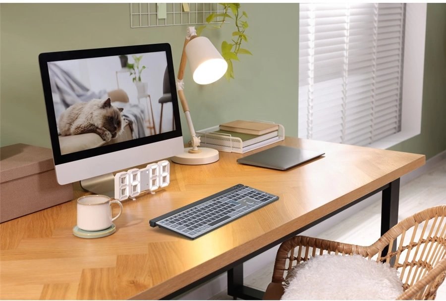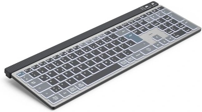 - moderná, plnoformátová bezdrôtová klávesnica pre viac zariadení- multi-device, možnosť ovládania 3 zariadení: 1x bezdrôtovo USB, 2x Bluetooth