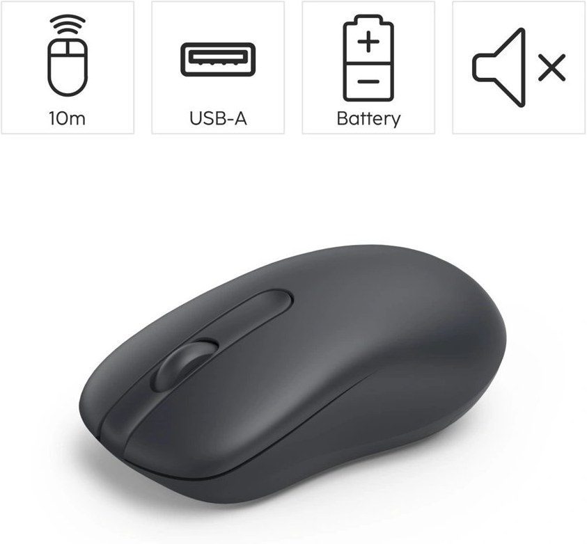myš, kancelárska, symetrická, USB-A bezdrôtový prijímač, optický senzor, nepodsvietená, 3 tlačidlá, tichý klik (silent click), max. citlivosť 1200DPI, čiernaZobraziť viac