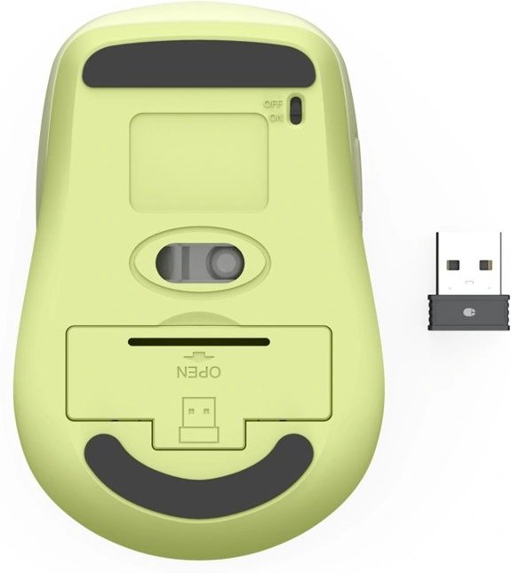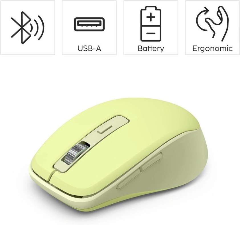myš, kancelárska, symetrická, USB-A bezdrôtový prijímač, bluetooth, optický senzor, nepodsvietená, 7 tlačidiel, tichý klik (silent click), max. citlivosť 1600DPI, zelenáZobraziť viac