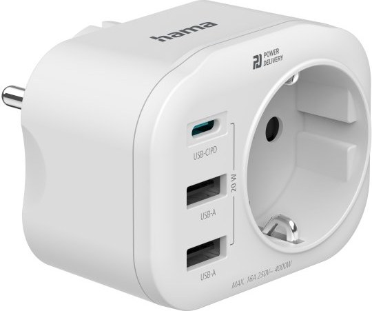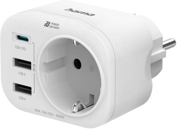 Hama zásuvková USB nabíjačka, 1x el. zásuvka, 1x USB-C PD, 2x USB-A, 20 W