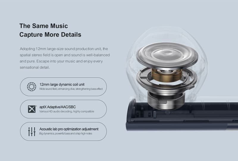 Haylou Moripods, podporované novou generáciou technológie adaptívneho dynamického dekódovania aptX, obnovuje zvukové detaily, vždy udržuje kvalitu zvuku na úrovni CD pre hudbu a pre hry prináša ultranízku latenciu.aptX je použiteľný pre mobilné telefóny platformy Qualcomm 855 a vyššie a telefónny systém musí podporovať aptX adaptive.
