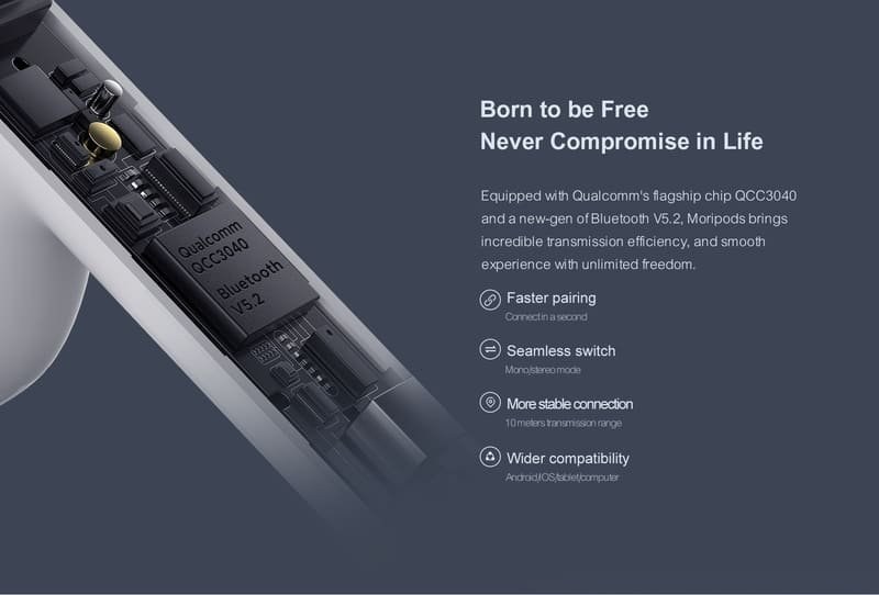 Vybavené vlajkovým čipom Qualcomm QCC3040 a novou generáciou Bluetooth V5.2, Haylou Moripods prinášajú neuveriteľnú efektivitu prenosu a plynulý zážitok s neobmedzenou slobodou.