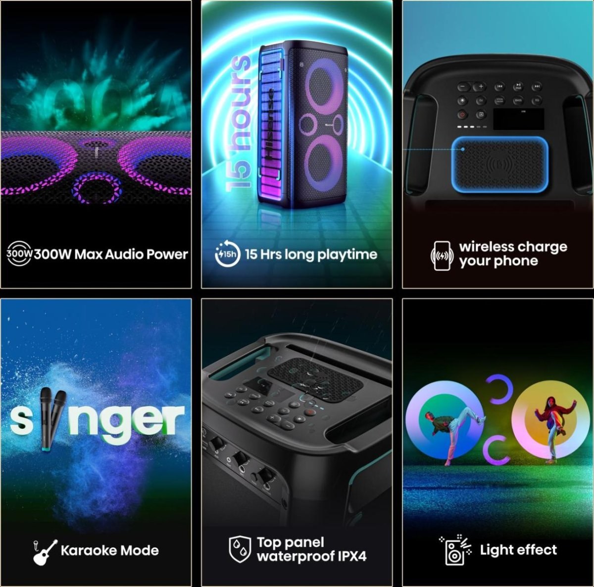 až 15 hodín nepretržitej zábavy vo dne v noci so silným zvukom s výkonom až 300 W