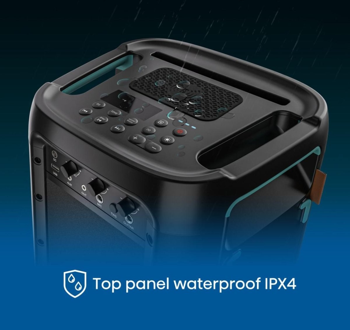 Mokrý reproduktor? Nemajte obavyVďaka vodotesnosti IPX4 na hornom paneli sa nemusíte obávať drobných kvapiek alebo striekajúcej vody a užívať si šťastné chvíle pri bazéne alebo rieke.