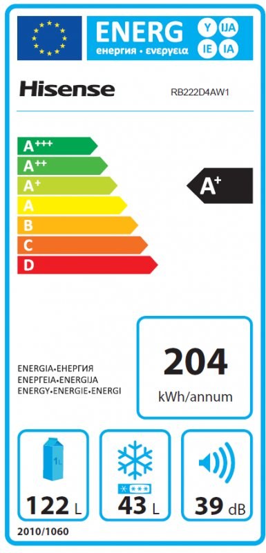 Chladnička je zaradená do energetickej triedy A+. V priebehu 24 hodín spotrebuje približne 0,558 kWh elektrickej energie. Chladniaca časť zariadenia disponuje čistým objemom 122 litrov, mraznička umiestnená dole má čistý objem 43 litrov. Prevádzka chladničky nie je rušívá, jej hlučnosť dosahuje maximálne 39 dB. Mraziaci výkon umožní zmrazenie 2,5 kg potravín v priebehu 24 hodín. Vaše potraviny budú v prípade výpadku elektrickej energie zmrazené 15 hodín.