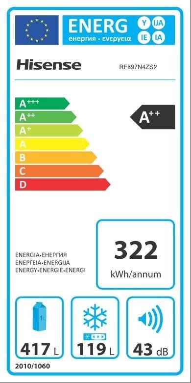 Beznámrazová chladnička s mrazničkouDodajte svojej kuchyni modernosť a funkčnosť a kúpte si túto špičkovú americkú chladničku Hisense RF697N4ZS2. Nielen, že vyniká obrovským vnútorným objemom 417 lv chladiacej a 119 lv mraziacej časti, ale očarí aj svojim luxusným nerezovým dizajnom, ktorý na čelnej strane dopĺňa dotykový LED displej. Navyše poteší aj nízkou hlučnosťou, úspornou prevádzkou a množstvom praktických funkcií.,