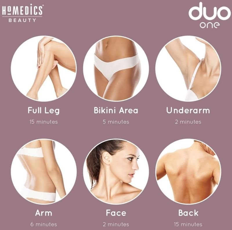 Nové dlhodobé riešenie na bezpečné a účinné zníženie rastu chĺpkov.Prístroj DUO ONE funguje pomocou nasmerovania svetelnej energie cez pigment chĺpka, kde sa zmení na tepelnú energiu, ktorá naruší vlasový folikul a zabráni chĺpku znovu vyrásť. Počas aplikácie nedochádza k strihaniu a nevytrhávaniu ochlpenia a jeho rast sa spomaľuje s minimálnou bolesťou. Môže sa používať na nohy, podpazušie, oblasť bikín, hruď, brucho, chrbát, ruky a miesta na tvári pod líniou lícnych kostí (neodporúča sa však na mužské ochlpenie tváre).