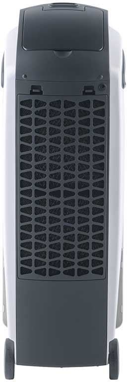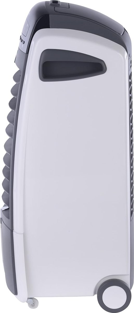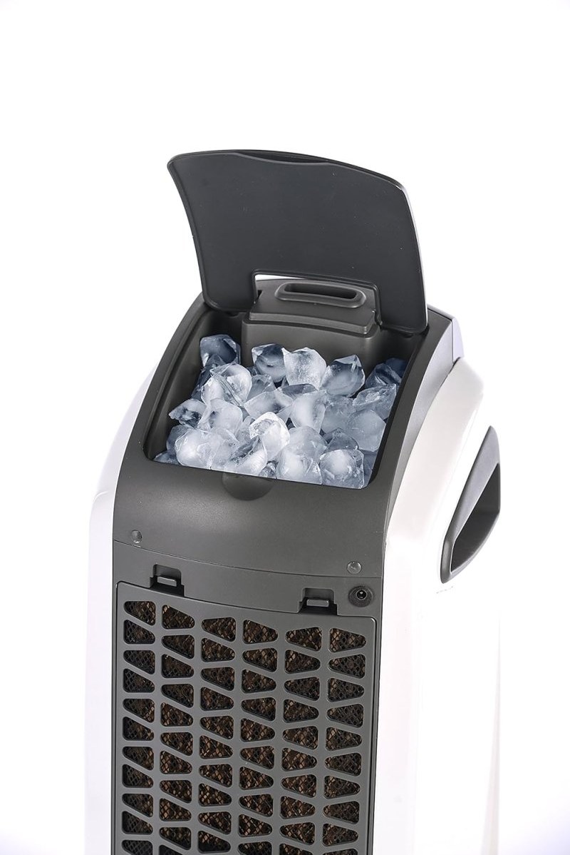 Vďaka kolieskam na spodnej časti je ochladzovač ľahko prenosný, čo umožňuje jeho flexibilné umiestnenie v rôznych miestnostiach. Praktickým doplnkom je schránka na ľad umiestnená v hornej časti prístroja, ktorá zvyšuje efektivitu chladenia. Zásobník na vodu je vybavený ukazovateľom množstva a svetelným aj zvukovým upozornením na prázdnu nádrž, čo zjednodušuje údržbu a zabezpečuje nepretržitú prevádzku.