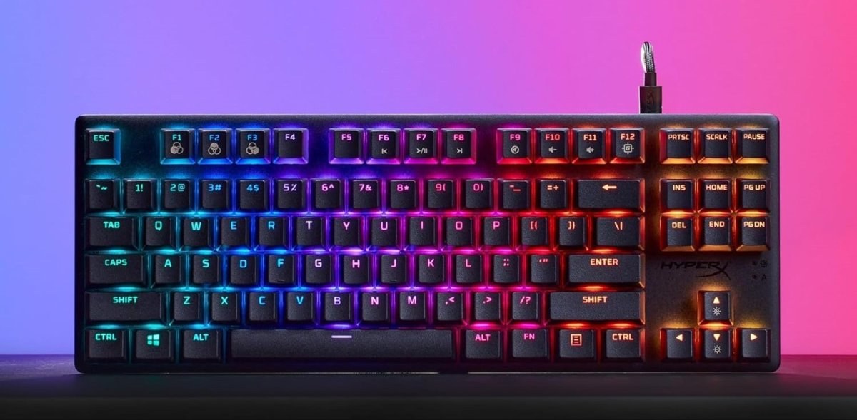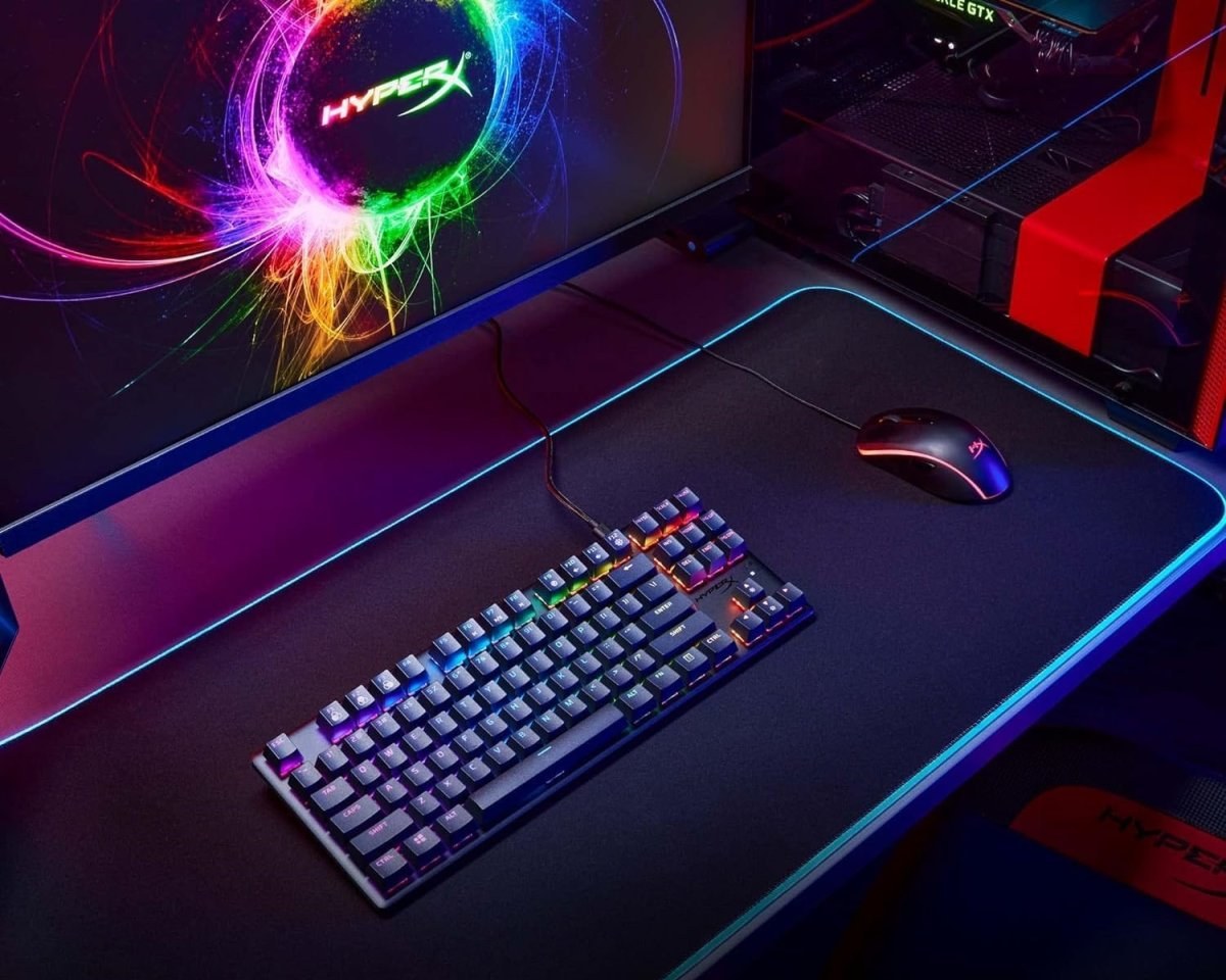 mechanické spínače HyperX Blue, RGB podsvietenie, dve úrovne náklonu klávesnice, PBT klávesy
