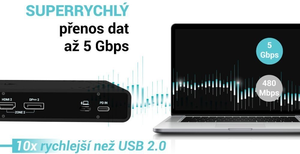 1x USB-C port pre pripojenie k zariadeniu s USB-C alebo USB-A rozhraním (prepojovací kábel USB-C a adaptér USB-C na USB-A sú súčasťou balenia)Technológia dokovacej stanice: DisplayLink + USB-C PD