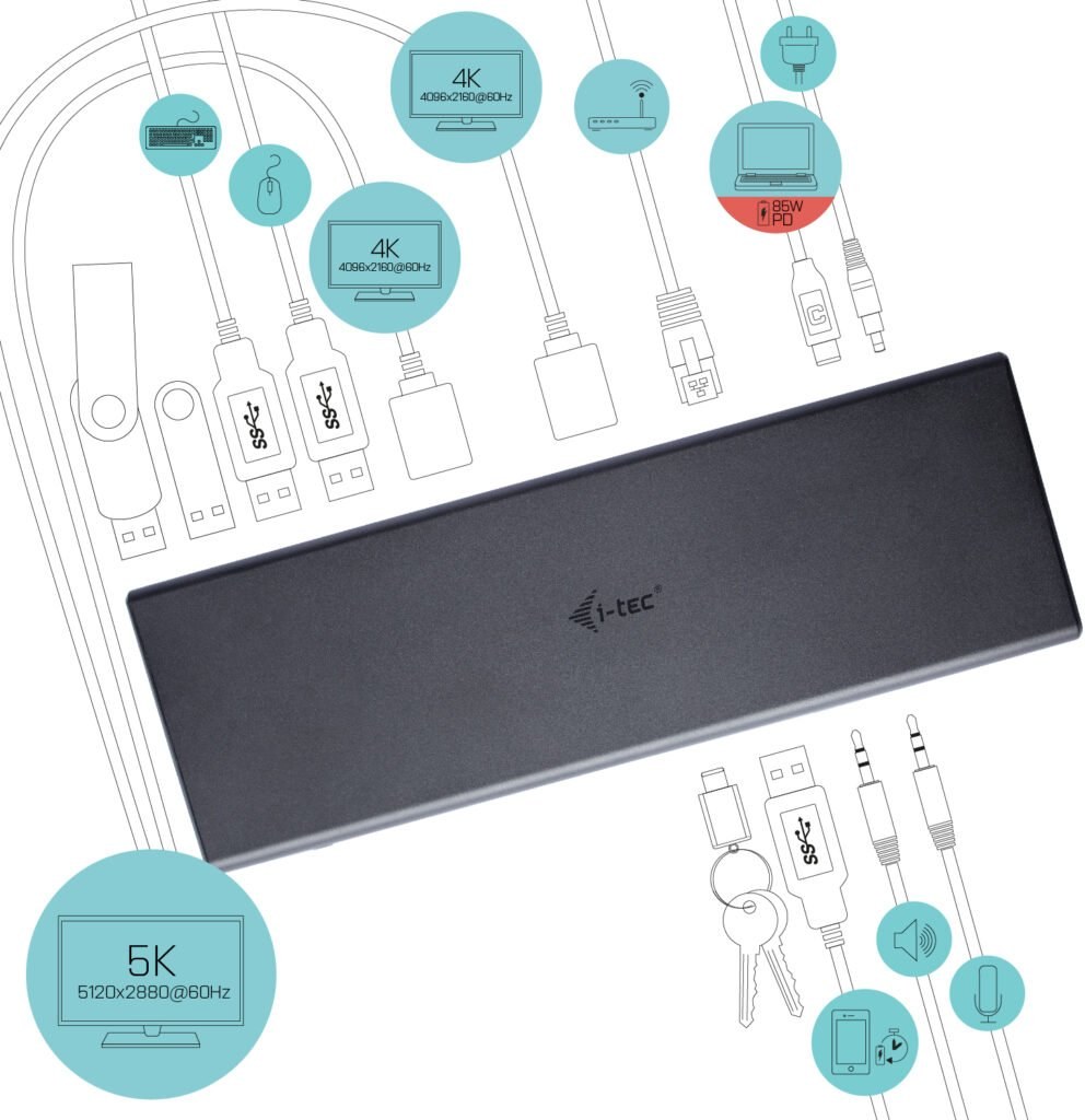 Excelentný výkon, univerzálne možnosti pripojenia, najvýkonnejšie čipové sady a ochrana vašej investície vďaka podpore súčasných i budúcich technológií. S touto profesionálnou univerzálnou dokovacou stanicou i-tec dosiahnete úžasné grafické rozlíšenie až 5K/60Hz, prípadne 2 x 4K/60 Hz. V prípade, že je dokovacia stanica pripojená k notebooku alebo tabletu, ktorý na svojom porte USB-C alebo Thunderbolt 3 podporuje nabíjanie, je schopná poskytnúť napájanie (Power Delivery) až 85W.*Prispôsobte si svoje pracovisko a pripojte k svojmu notebooku alebo tabletu s USB-A 3.0, USB-C, alebo Thunderbolt 3 rozhraním svoje obľúbené príslušenstvo. Vďaka tejto dokovacej stanici sa vyhnete neustálemu pripájaniu a odpájaniu všetkých zariadení zakaždým, keď si beriete váš notebook alebo tablet so sebou. Výhodou je tiež väčší poriadok na pracovnom stole, odkiaľ zmizne neprehľadná spleť káblov. Dokovaciu stanicu stačí pripojiť jediným káblom a okamžite ju môžete začať využívať. Prepojovací kábel s oboma koncovkami (USB-C na C, USB-C na A) je súčasťou balenia. Inštalácia ovládačov je automatická zo systému Win 10, pre ostatné operačné systémy si prosím stiahnite ovládače tu.