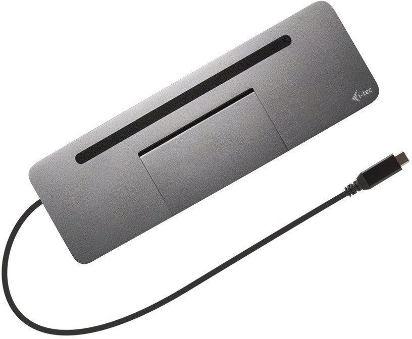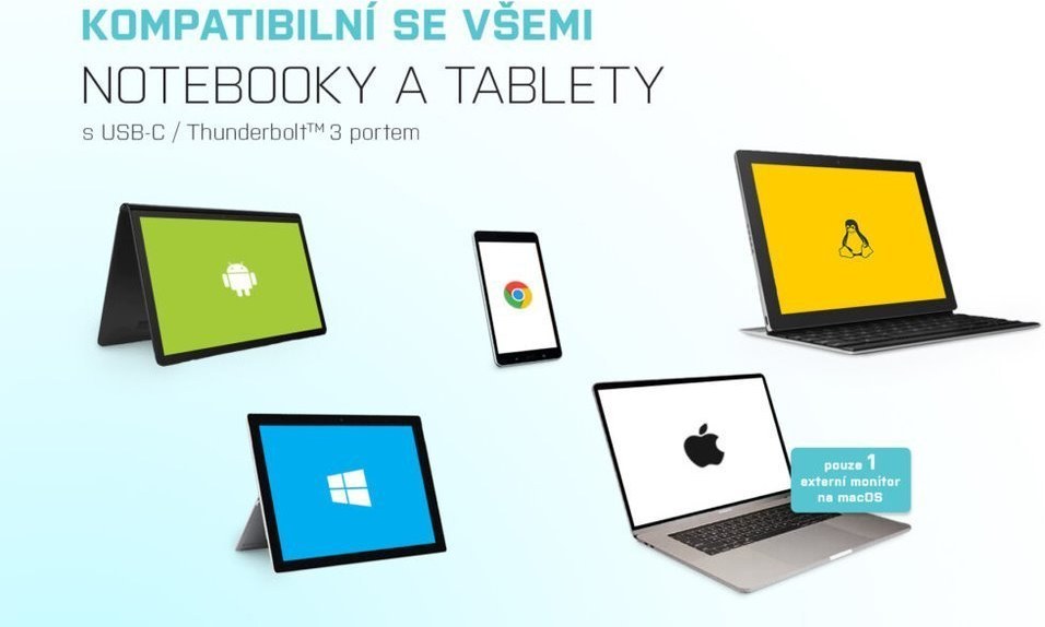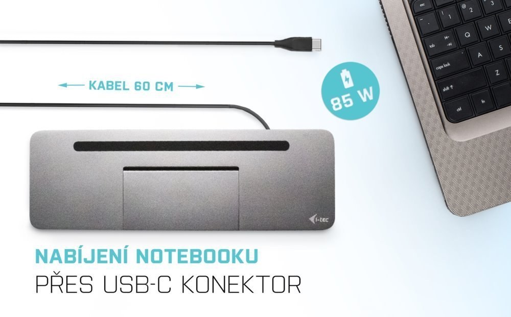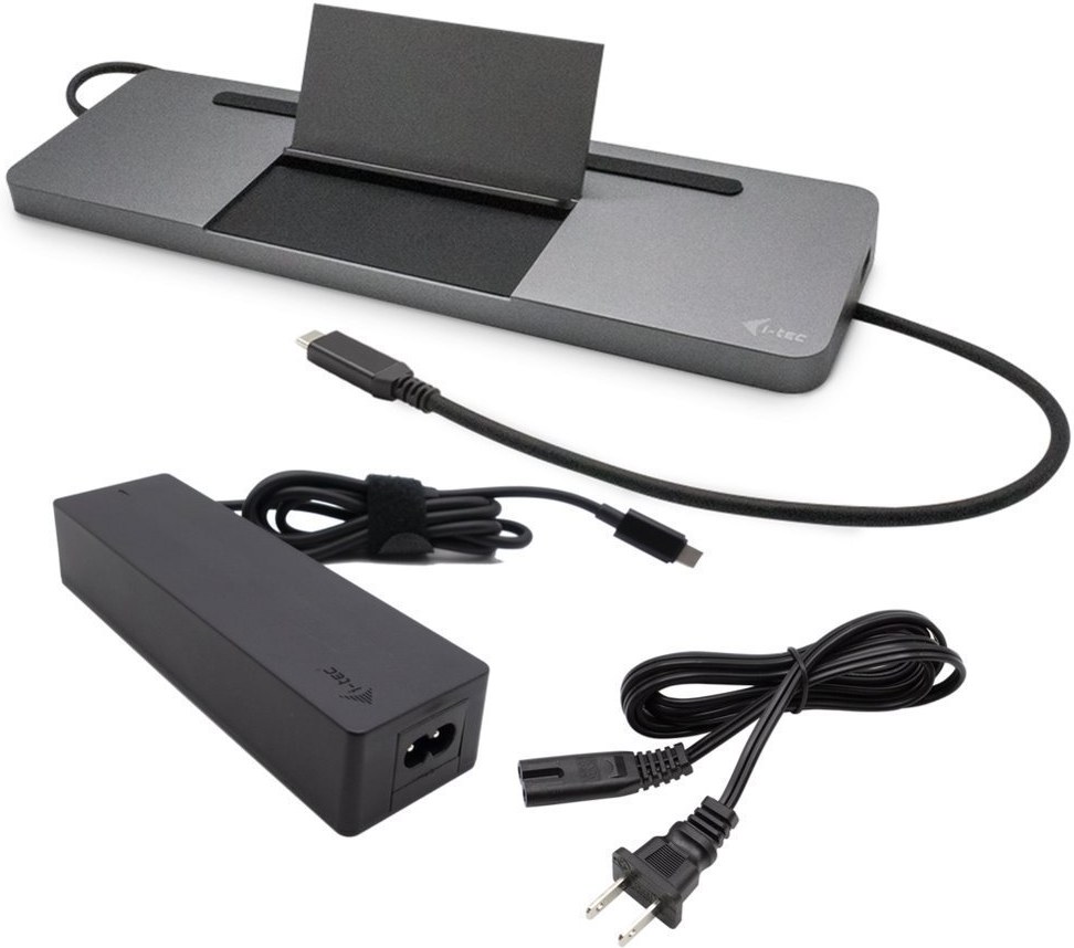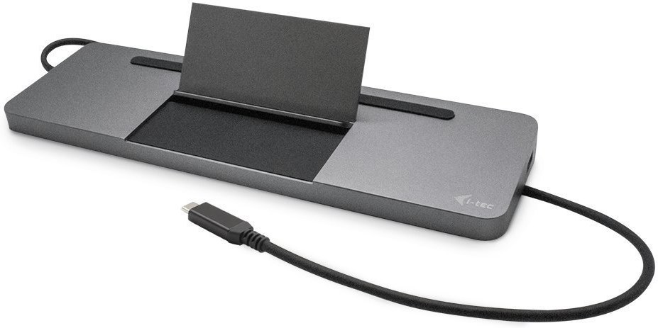 Ergonomická kovová dokovacia stanica podporujúca pripojenie až troch monitorov. K počítaču či notebooku sa pripája pomocou USB-C portu s podporou Thunderbolt 3/4 a je tak schopná na podporovaných zariadeniach prenášať aj napájanie až 85 W. Vysokorýchlostný prístup k internetu je možné realizovať cez prítomný RJ-45 port. Pre pripojenie periférií sú prítomné dva USB 3.0 porty a dva USB 2.0 porty. Na pripojenie slúchadiel či mikrofónu potom slúži kombinovaný 3,5 mm konektor. Poteší aj slot pre SD a microSD karty. Dock je možné použiť aj ako praktický stojan pre notebook či tablet.Súčasťou balenia je univerzálny napájací adaptér USB-C s výkonom 100 W.