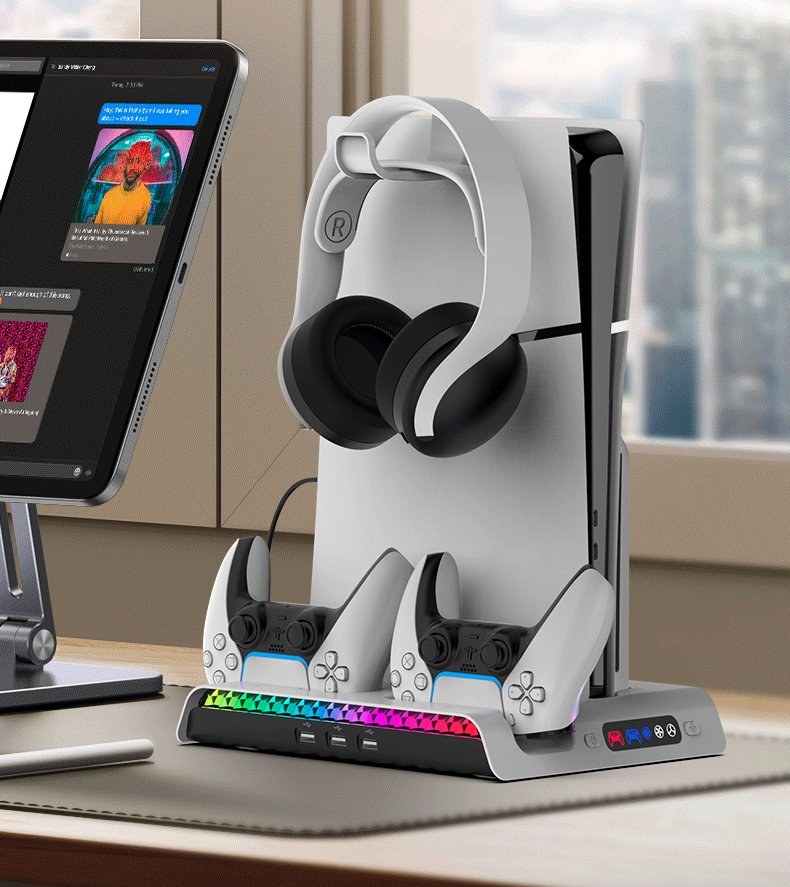 iPega multifunkčný nabíjací RGB stojan s chladením pre PS5 Slim, biely