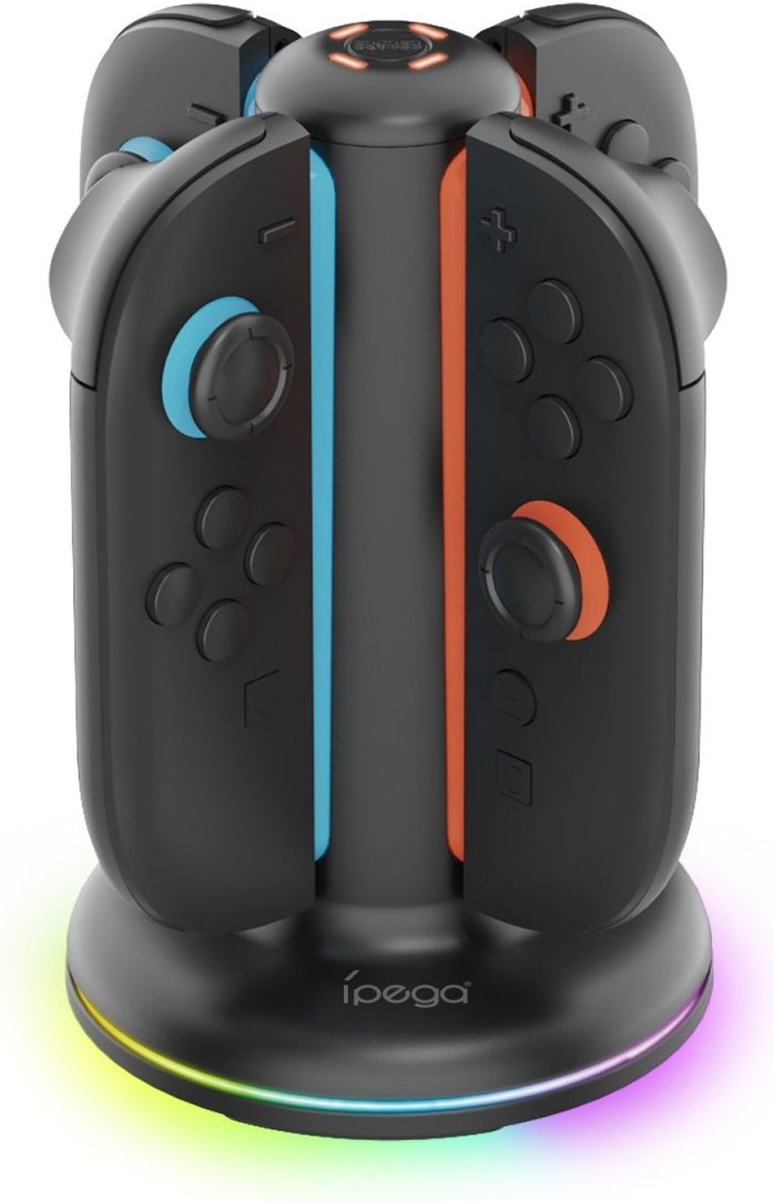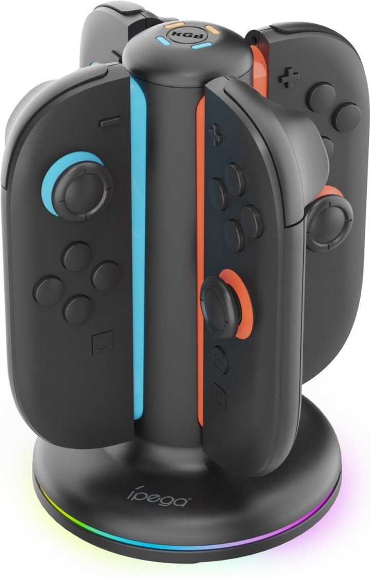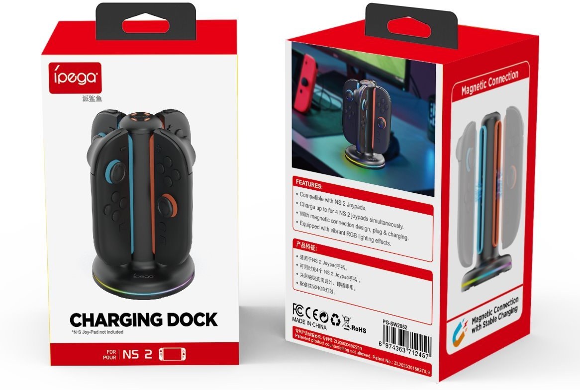 iPega SW2052 Nabíjacie stanice pre JoyCon ovládače Nintendo Switch 2 - Efektívne nabíjanie v štýlovom prevedeníUdržujte svoje JoyCon ovládače vždy pripravené na akciu s touto nabíjacou stanicou, špeciálne navrhnutú pre Nintendo Switch 2. Elegantný a kompaktný dizajn s až 4 nabíjacími slotmi umožňuje súčasné nabíjanie viacerých ovládačov a zároveň ponúka štýlové podsvietenie, ktoré ozvláštni váš herný setup. Dotykový spínač umožňuje prepínanie medzi 9 farebnými režimami RGB osvetlenia – vyberte si ten, ktorý sa najlepšie hodí k vášmu hernému štýlu. Každý slot má indikátor, ktorý v reálnom čase zobrazuje stav nabíjania jednotlivých ovládačov. Integrovaná ochrana proti skratu, nadprúdu aj prebitiu - pre bezpečné a spoľahlivé nabíjanie bez starostí.