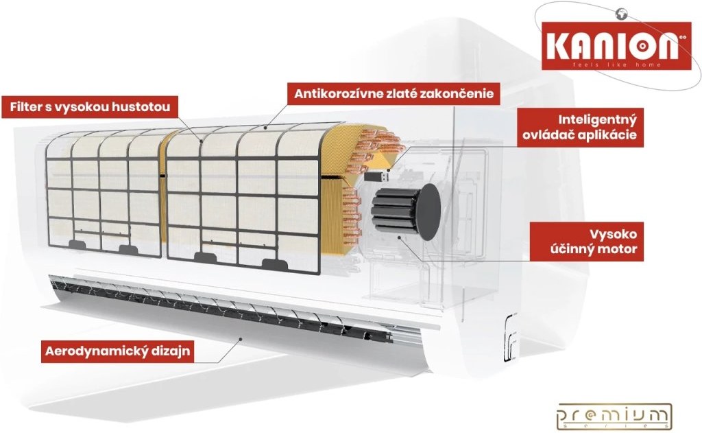 Klimatizácie Kanion Premium Series prinášajú dokonalú kombináciu elegantného dizajnu, vysokej účinnosti a moderných technológií.Objavte dokonalé riešenie chladenia s klimatizáciou série Premium A+++ R32 bezkanálovým splitovým typom DC invertora 50 Hz. Tento pokrokový klimatizačný systém, kombinuje najmodernejšiu technológiu s energetickou účinnosťou.