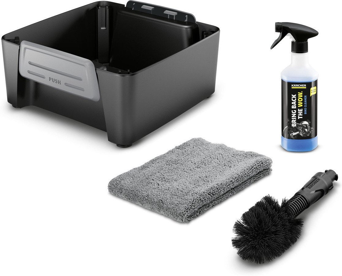 S optimálne prispôsobeným príslušenstvom z boxu na príslušenstvo Bike vyčistíte bicykle dôkladne a šetrne. Univerzálna kefa s mäkkými štetinami sa môže pripojiť k striekacej pištoli a odstráni nepoddajné znečistenie. Čistiaci prostriedok uvoľní z bicykla typické znečistenie a pritom ochráni citlivé komponenty. Vysokokvalitná flaušová utierka z mikrovlákna vysuší vyčistené predmety pred uskladnením. Na odkladanie príslušenstva slúži dodaný box, ktorý sa dá upevniť na tlakový čistič.
